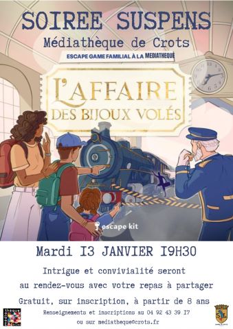 Soirée suspens à la médiathèque de Crots autour d'un escape game familial et d'un repas partagé.
